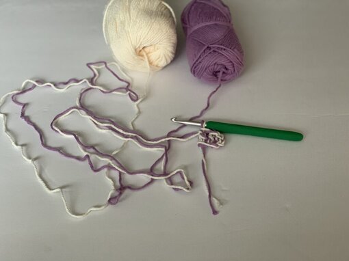 In double-stranded yarn, ch 12. Hdc in each st across (11 st)